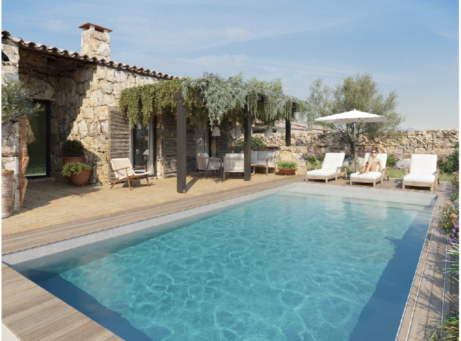 La bergerie sera revêtue entièrement de pierres pour une intégration totale dans le paysage. De gros blocs seront insérés sur chaque façade des maisons pour lui conférer plus de charme et donner un effet plus atypique à l’habitat. Cet aspect extérieur traditionnel sera combiné à un intérieur au confort contemporain : pergola, peinture intérieure lisse blanche, carrelage 60x60 avec plinthes assorties, climatisation par pompe à chaleur, menuiseries extérieure en aluminium, baies vitrées à galandage, salles de bains aménagées, douche à l'italienne, wc suspendu, ... Coté jardin, un espace propice à la détente, pour les amoureux du farniente, profitez de la piscine avec sa plage et de la vue sur le jardin pour apprécier la douceur de la Corse au quotidien en toute intimité. La piscine a l’aspect de bassin pour lui conférer un aspect authentique en adéquation avec l’environnement rustique et campagnard qu’impose le site. Le jardin est planté d’essences locales comme les oliviers, les arbousiers, les myrtes etc. La flore très présente sur le terrain sera renforcée par des plantes du maquis pour lui donner un caractère naturel en adéquation avec l’environnement local. Ce domaine veut mettre en valeur le terrain en évitant une densification trop importante de l’habitat et en proposant une architecture traditionnelle adaptée à l’esthétique du site.